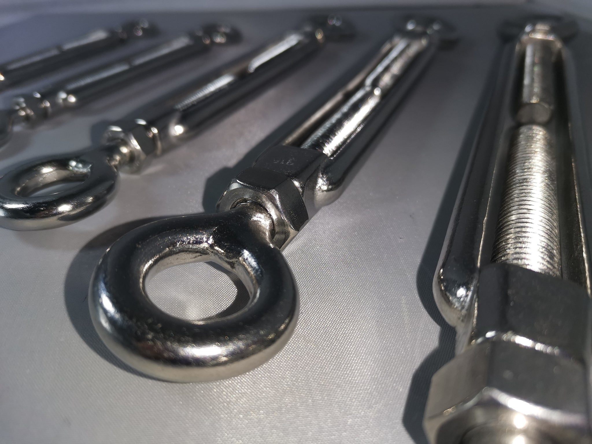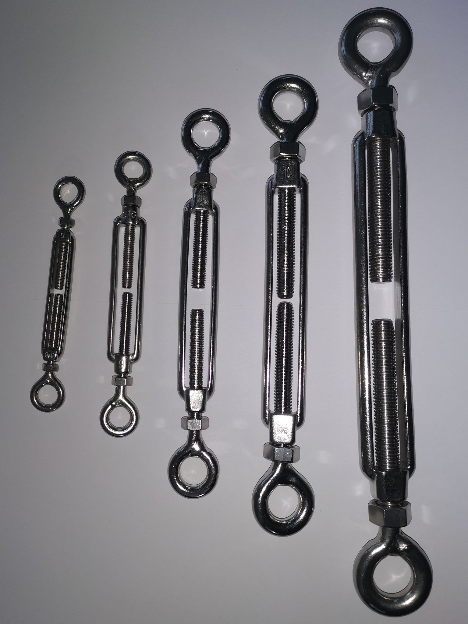 For those uses of a semi-industrial nature we find these open barrel turn buckles ideal to cope with most tensioning uses. Easy to see what is going on and to grip by hand to twist up.