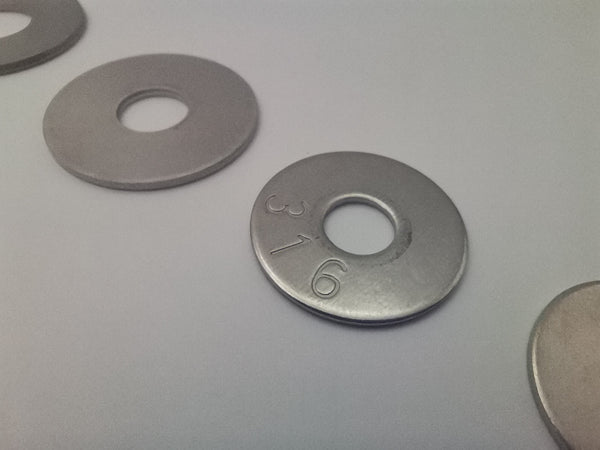 A large (but not our largest) flat washer which gives extra bearing surface where required such as on ladders, hand rails and cleats.