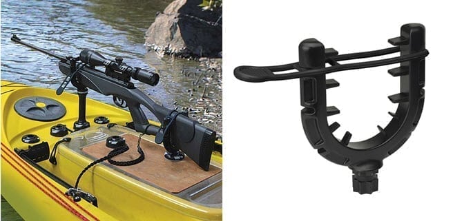 This Gun Holder allows you to safely stow and transport your rifle or shotgun. The flexible rubber fingers shape to fit different gun butts and the strap secures the rifle against vibration and damage.