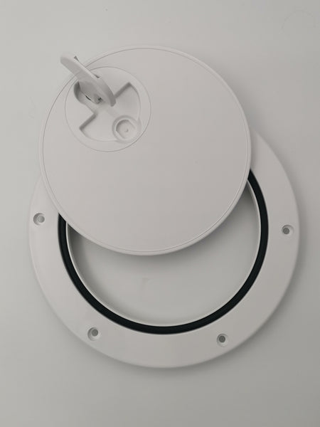 Made from UV stabilised ASA plastic with neoprene lid seal giving splash proof finish in vertical installations. Simply turn twist lock recessed handle to open and remove hatch lid to allow full access through port.