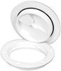 When closed screw holes are covered. The cover, when on, covers the fastenings. Has a built in heavier O-ring seal, and a deep thread to ensure no water gets in.