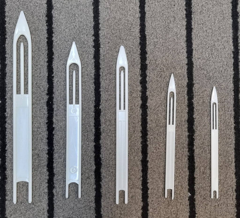 The conventional style allows you to wind the netting repair twine around the needle then thread or pass it through the hole in the net. 1 of each size # 3, #4, #5, #6, #7. Price is for a set as pictured.