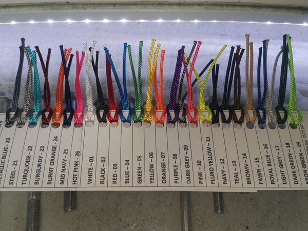 Standard colours are White, Black, Red, Blue, Green, Yellow, Brown, Navy