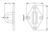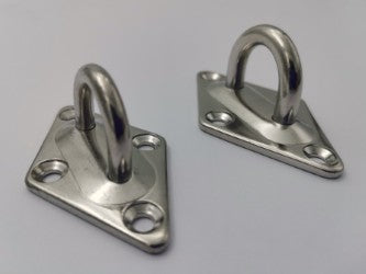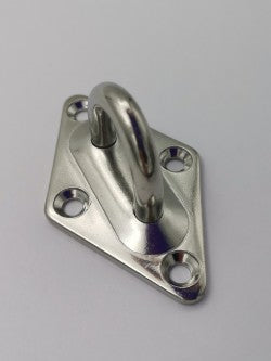 Stainless steel eyeplate for fastening pulleys or ropes to the deck or bulkhead, These are a pressed stainless plate and back welded underneath. Not suitable for a lifeline attachment point.  For a heavier attachment point see our cast eyeplates.