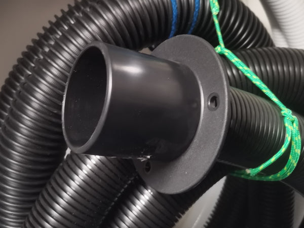 Where the hose enters or exits the outboard well, you have the choice of either a 90 degree rounded flange or a 45 degree rectangular block as pictured. Both model flanges can be reversed so they are flushed inwards or surface mount outwards.