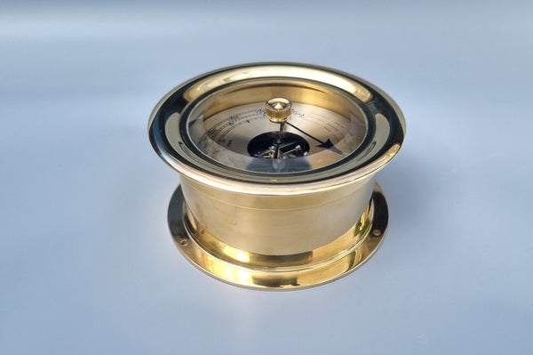 Solid brass & fully polished, the barometer has scales of inches, centimeters and millibars. A finely finished instrument. The front unscrews. 115mm dia x 55mm deep.