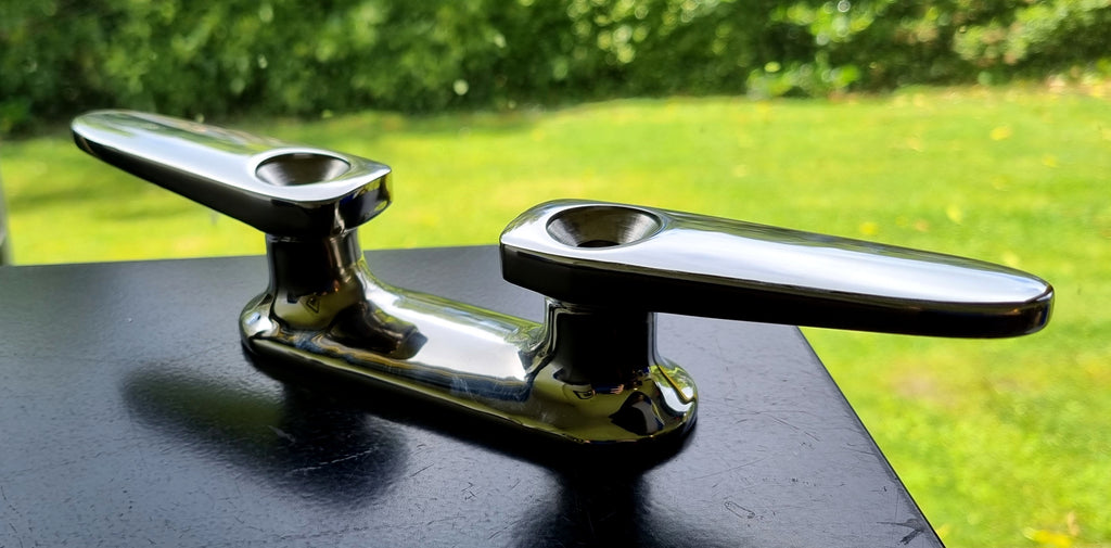 Traditional open cleat in stainless steel with through bolt countersunk fastening holes means the bolts become an integral part of the cleat rather than through extended feet, to suit 10mm bolts. (yes we stock countersunk 10mm bolts of needed also)