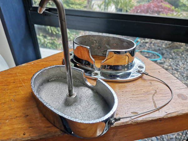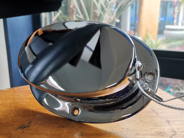 A pressed stainless steel chain pipe in the oval lift lid style, designed for up to 10mm short link chain storage.