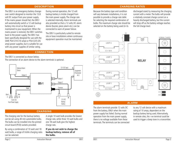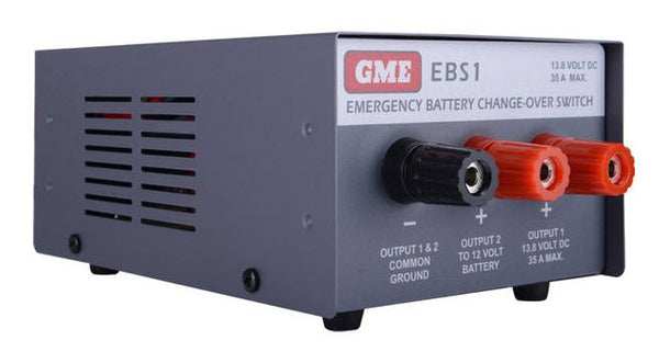 The GME Electrophone EBS-1 is an Emergency Battery changeover Switch designed to monitor the 13.8 Volt DC output from your power supply. If the main power should fail, the EBS-1 will automatically switch a 13.8 Volt backup battery into circuit so that the power is maintained to your equipment. When the main power is restored, the EBS-1 switches back to the power supply.