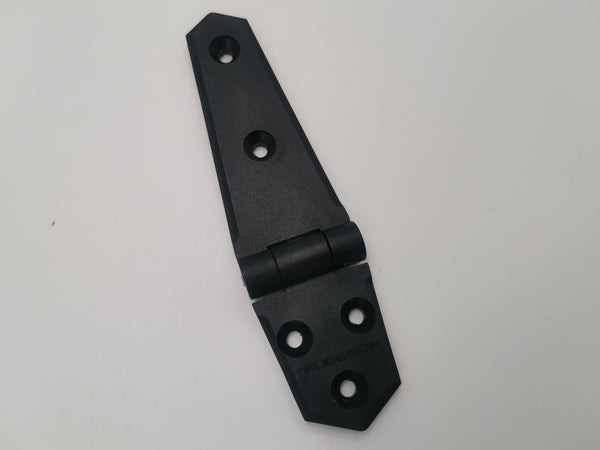 Heavier in construction than the usual plastic hinge. Moulded from a glass reinforced nylon composite. High strength, high-modulus glass fibres impregnated into the nylon provides dramatic strength, stiffness, toughness, and dimensional stability. A stainless steel pin links the two hinges. Lightweight and white in colour.
