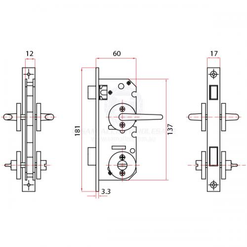 17mm wide (at striker plate) x 181mm high (including striker plate) x 60mm deep and back set (front plate to centre of pivoting handle) of 40mm.