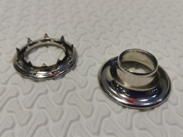 Nickel plated brass sailmakers ring eyelets, normally put in with a punch but in an emergency can be hammered and peened over.