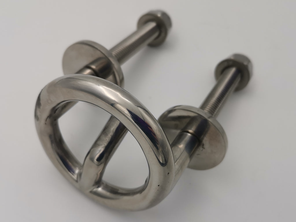 As used on many production line American runabouts. Transom mounted, water sports tow eyes. Protector ring prevents snagging of clothing, ski equipment, ropes and similar. Hex nuts and backing washers included.