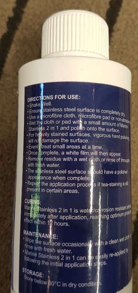 - Wet the cloth or pad with a small amount of Marine Stainless 2 in 1 and polish onto the surface.